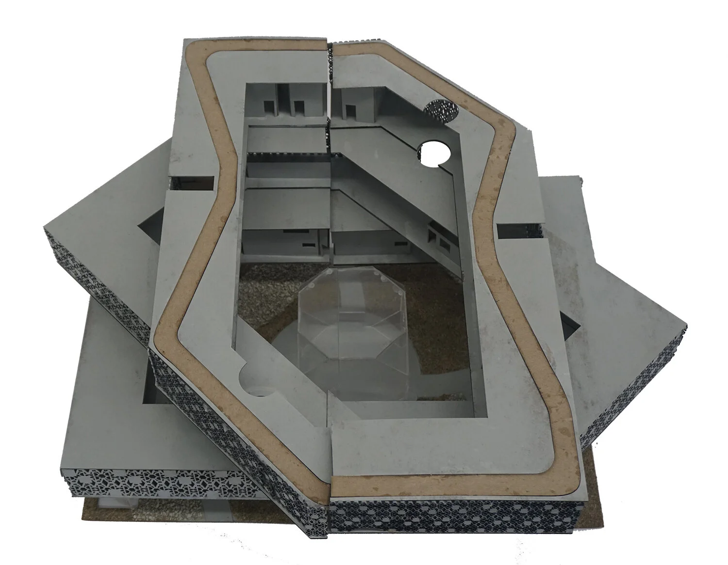 The complex started with a simple hollow rectangular shape, then that shape being rotated 20 degrees on multiple levels that. That surrounds the box in the middle to give the music box feeling. Using my minor in Graphic Design, I used typography to design the wallpaper. The colors are warm with hints of gray to give warmth to the viewer to enjoy the wallpaper. It is very simple and elegant. For the Nest project, a music box, the wallpaper was being used as the wall for the box. The voids of the wall let light go through and gives the viewer a sneak peak of what is inside the box.