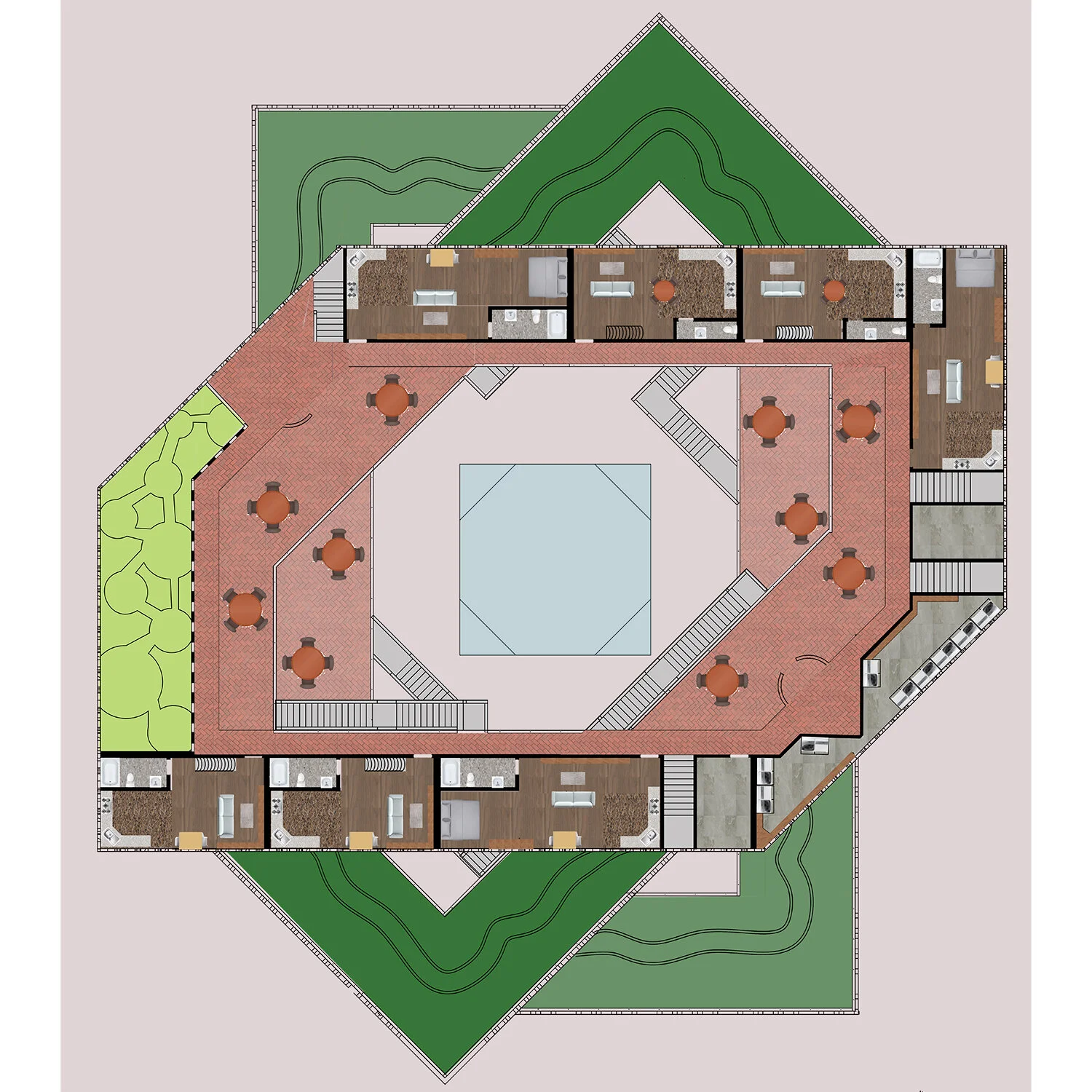 The first floor is mainly a lobby and the mail boxes for the residents and private stair case to get access to the rest of the complex. On the roof of the complex there is a track for people to run and exercise. The elevators are glass elevators.